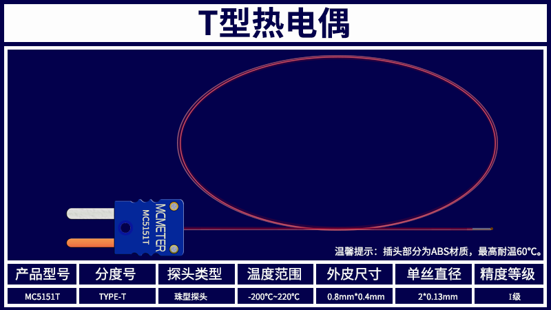 前瑾MCMETER MC5151T T型热电偶-200~220℃温度表温度计测温线
